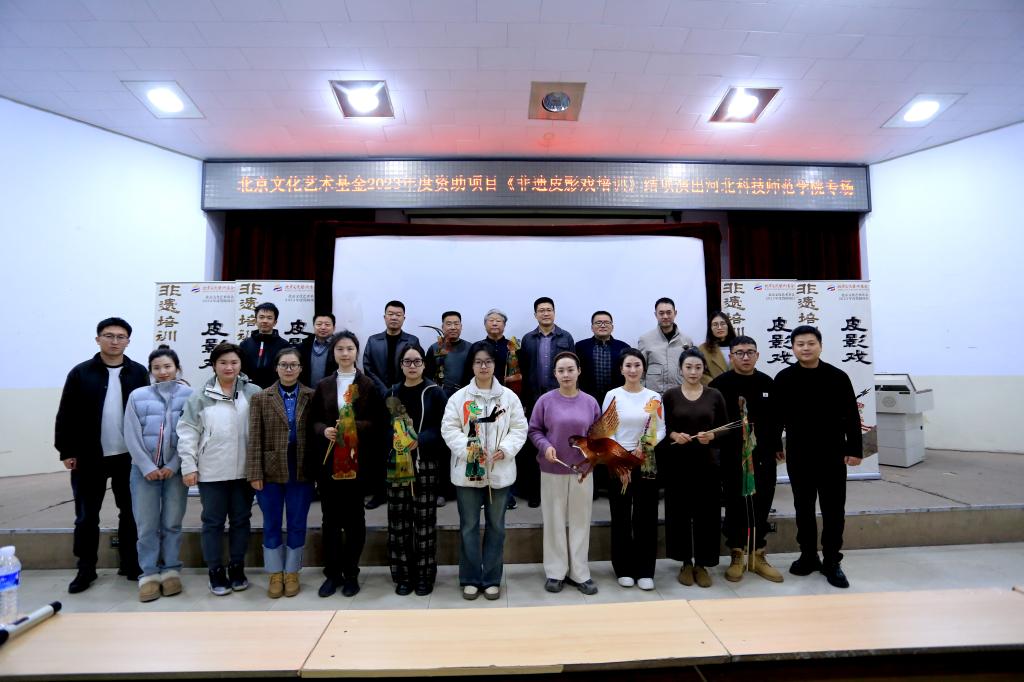 演出在灯光璀璨的舞台上拉开帷幕,皮影艺人们以其精湛的技艺和深厚的艺术功底,将一幕幕经典故事娓娓道来。首场剧目《牛郎织女》以其凄美的爱情故事,让观众感受到了传统皮影戏独特的艺术魅力与情感张力。《武家坡》以其生动的戏剧冲突与人物塑造,展现了皮影戏在叙事与表演上的高超技艺。《武松打虎》则以其惊险刺激的情节与逼真的动作表现,赢得了现场观众的阵阵掌声与喝彩。压轴剧目《火焰山》以其宏大的场景设计与奇幻的视觉效果,将整场演出推向了高潮,为观众带来了一场视觉与心灵的双重盛宴。演出结束后,非遗传承人与同学们深入讨论了昌黎非物质文化遗产的传承与创新,国家级非物质文化传承人刘立新老师希望同学们能够热爱中国传统文化,积极参与到保护昌黎非物质文化遗产的工作中。