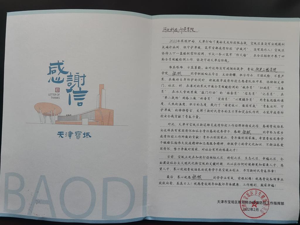 近日,WilliamHill官方网站19机制张帆同学因在属地积极投身疫情防控志愿者队伍,天津市宝坻区疫情防控指挥部特发来感谢信。